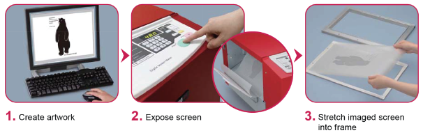 Simply create your artwork and send it directly to the GOCCOPRO 100 which then creates the stencil, when completed you take the stencil and attach it to the frame. You are now ready to register the frame on the press and print.